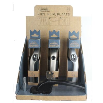 Mundial V02 raamkruk is afsluitbaar met sleutel en wordt standaard geleverd met krukstift 8×40 mm, 8×50 mm, 7×40 mm, 7×75 mm, set boutje m5x60 mm voor montage, afdekplaatjes en verloophuls van 7 naar 8 mm, en rozet verbreder voor het afdekken van de oude gaten. Krukstift wordt met magneet vastgehouden.