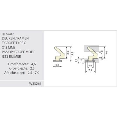 T-groefprofiel, kunststof en aluminium toepassing, voetbreedte 6,8 mm