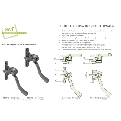 SWF B205 Scroll Classic raamboom is afsluitbaar met sleutel en heeft een montageplaat met 4 schroefgaten.